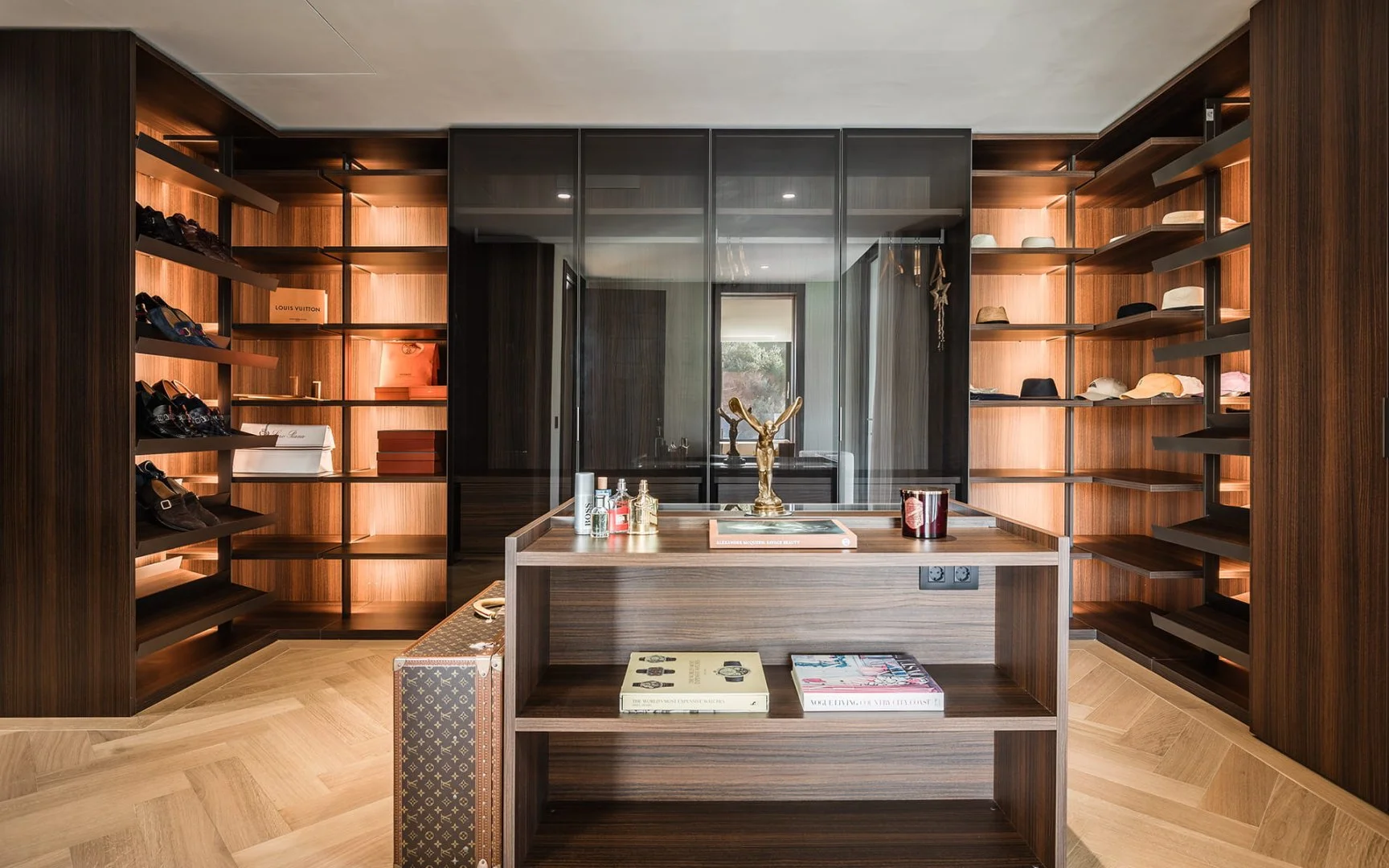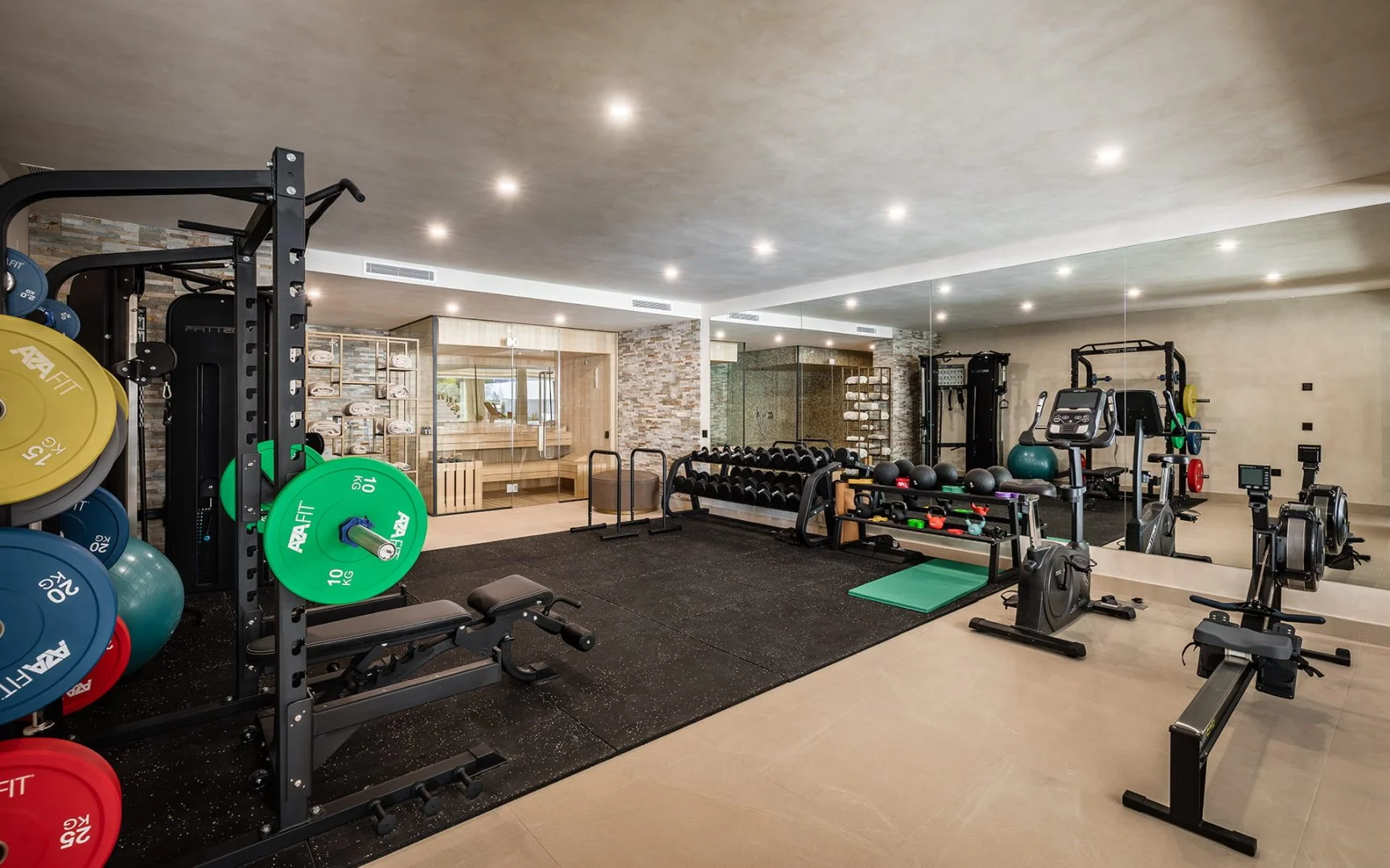 Lifestyle amenities are a defining feature of the property. These include a private wellness area with sauna and steam room, a games and entertainment room, wine cellar, massage room, and a private lift providing effortless access to all levels. The rooftop solarium is designed as an additional living space, with lounge areas, BBQ, shower, and open views—ideal for both daytime relaxation and evening gatherings.