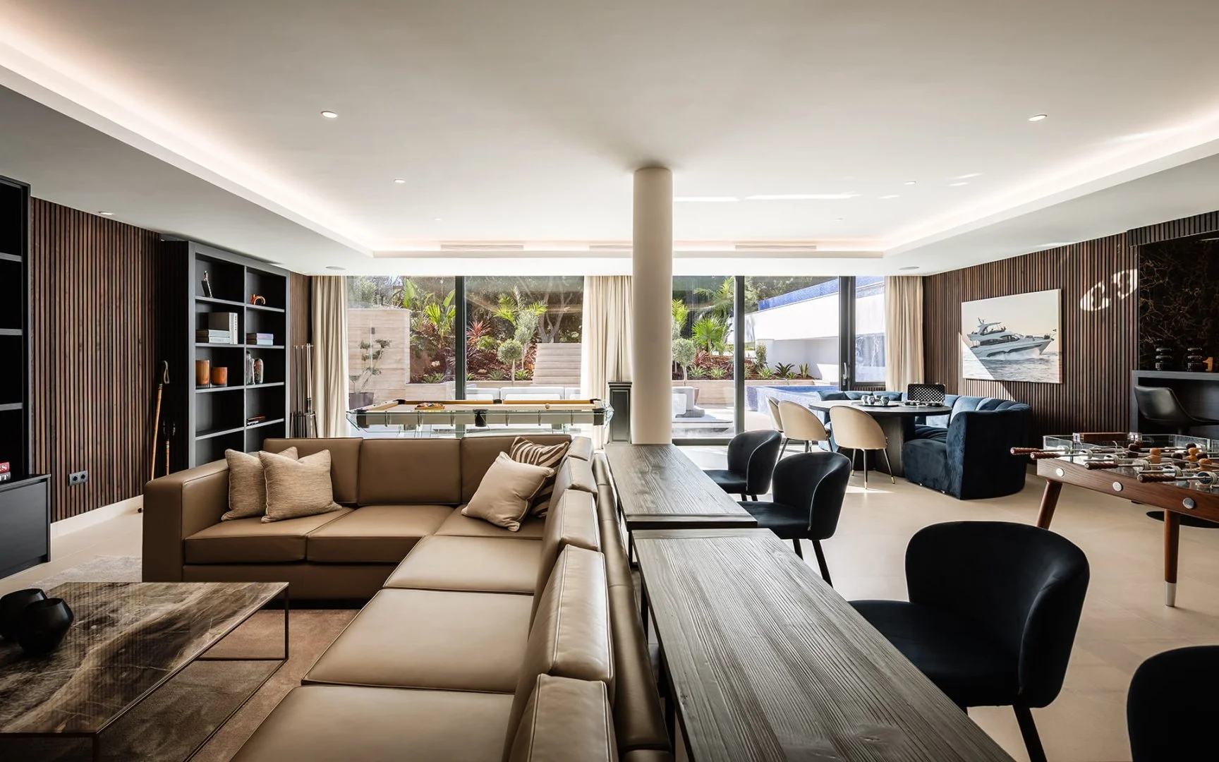 The layout has been carefully considered for both relaxed daily living and elegant entertaining. The main living areas flow around a fully equipped Gaggenau kitchen with central island, complemented by a separate preparation kitchen and direct access to outdoor dining and BBQ areas. The villa offers seven generously proportioned bedrooms, all with en-suite bathrooms, ensuring privacy and comfort for both residents and guests.
