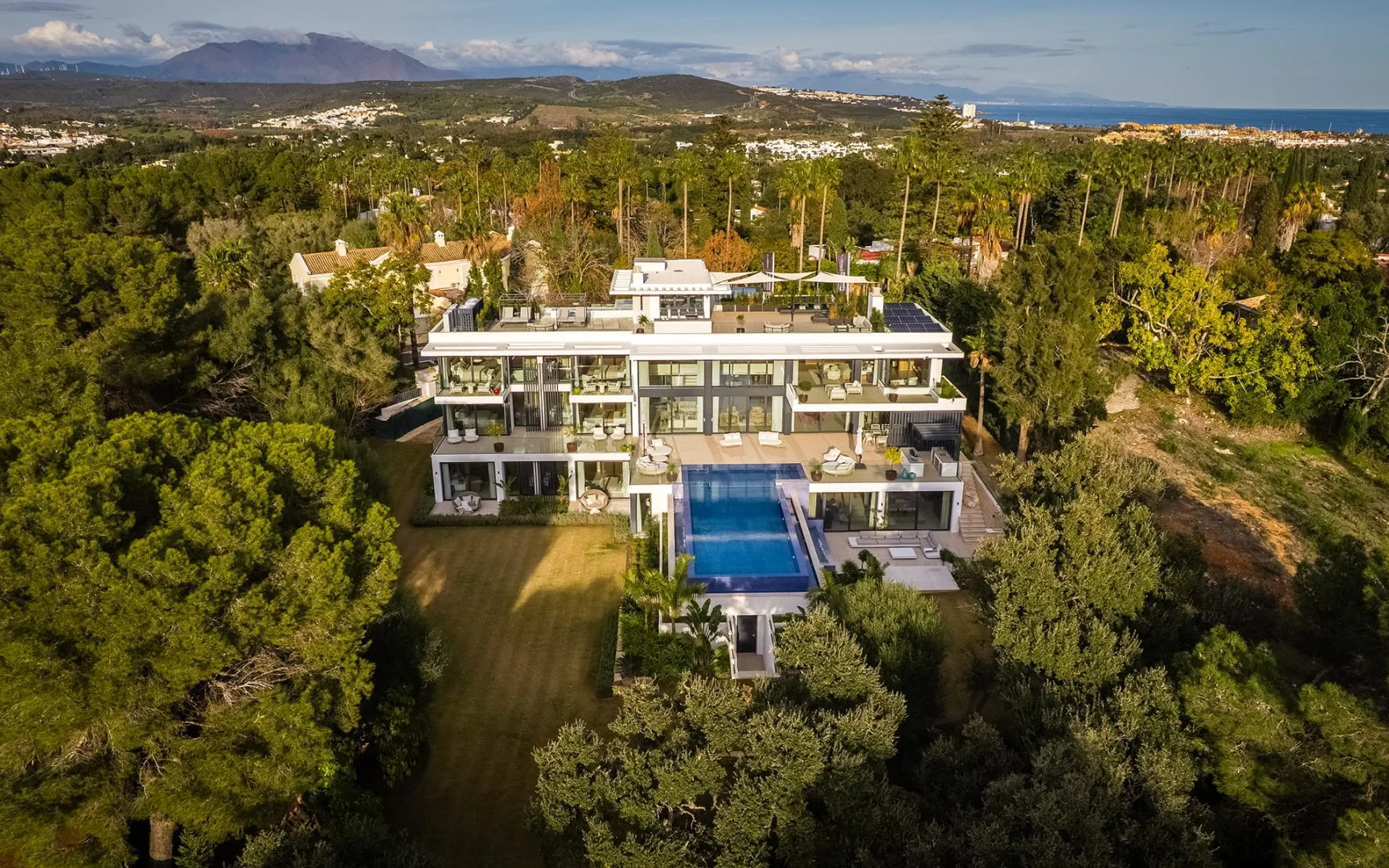 The outdoor areas are equally impressive, with a sleek infinity pool, mature gardens, and multiple covered and open terraces that create a tranquil, resort-like atmosphere. A spacious private garage provides secure parking for several vehicles.